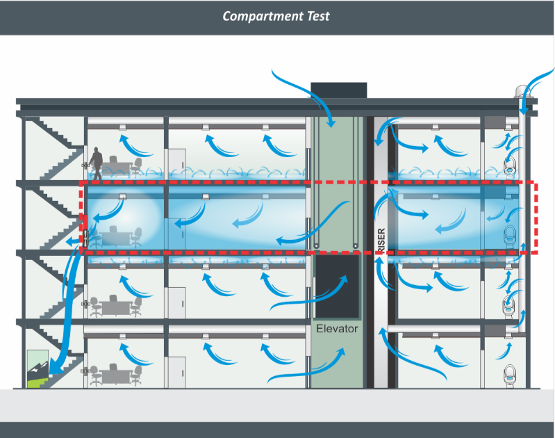 - Smoke leakage visualization – To identify leakage pathways throughout an area that may be applicable across the rest of the building. It is also helpful to educate and demonstrate.