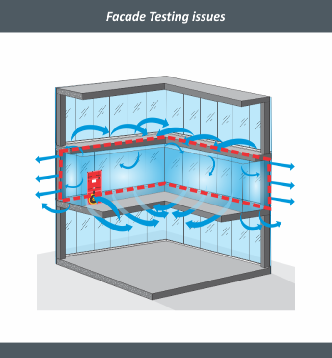 Compartment blower door testing is testing a part of the building envelope. Facade testing is also considered compartment testing. Only the surface area connected to the outside is to be used to determine the leakage rate. However, results include leakage internally through the building as well as via the external surface area. For example, an intermediate floor can only take into account the facade but will leak air from the floors above and below. This results in compromised data. Compartment testing should include multiple different types of areas, top floor, ground floor and intermediate. This method of testing is not detailed in any international standards.
