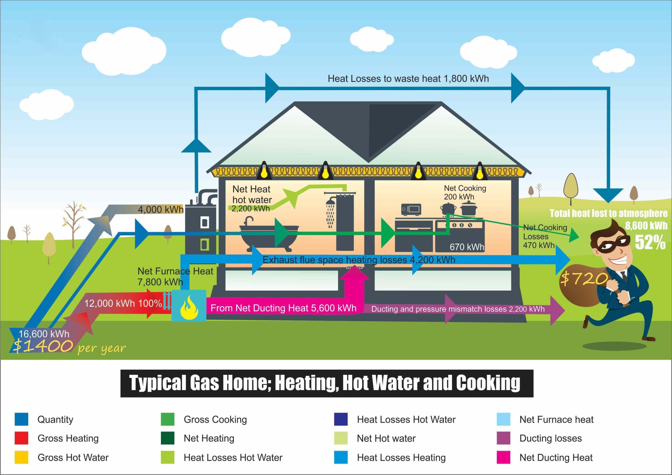 Gas bills are in MJ units (megajoules) of gas consumption, here is a diagram where we have converted MJ into KWh (kilowatt-hour) so that you can see the energy that is lost in the combustion and distribution processes of gas appliances.