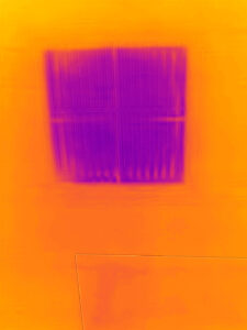 Thermal imaging of evaporative cooler that is off: Cool or hot air can travel freely out of the house in this state. Sealing these vents during summer or when not in use is best practice.