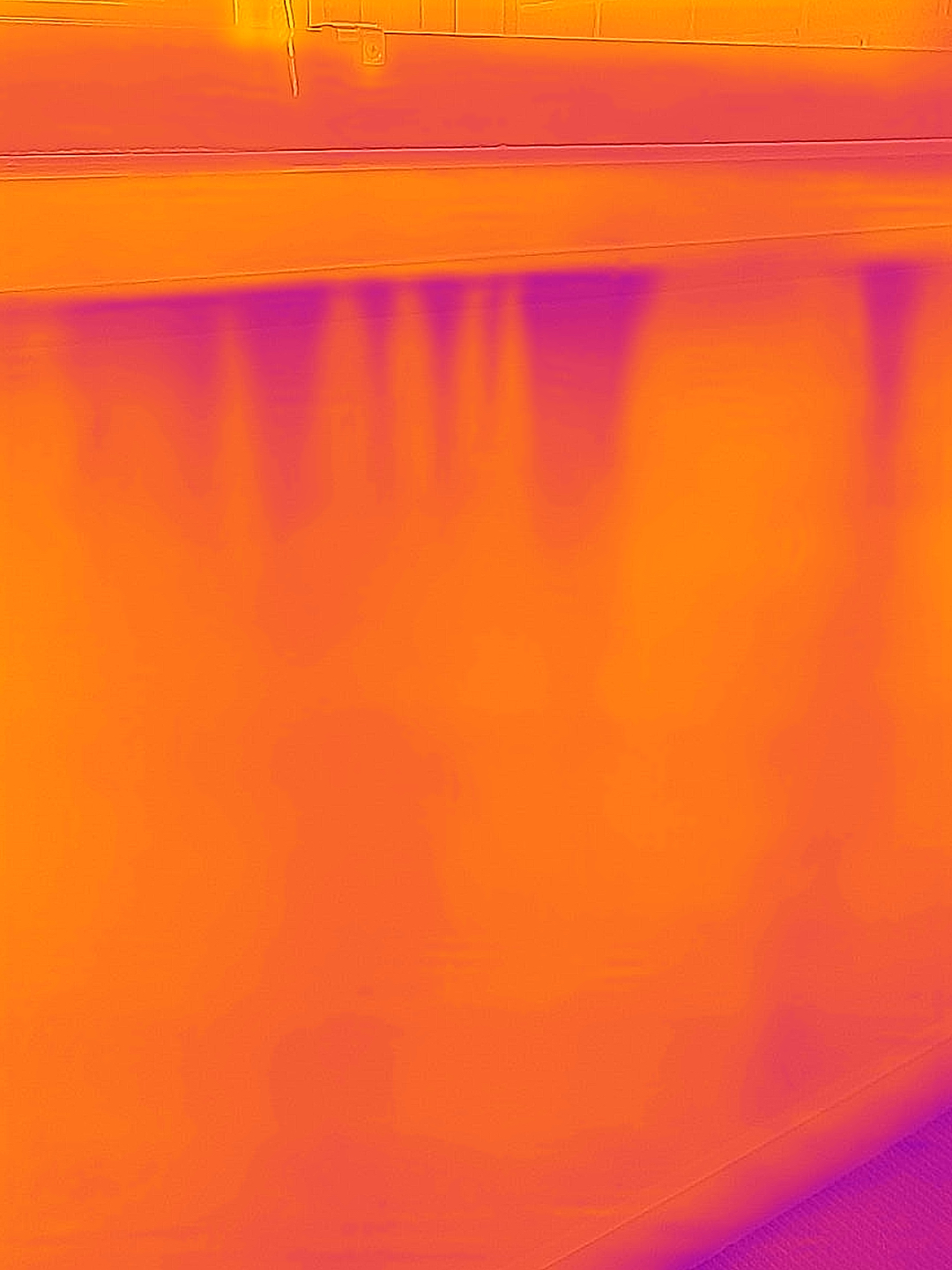 Thermal imaging used in conjunction with blower door testing visualises building imperfections. Here, skirting is not joined to the hard flooring. This can be fixed with caulk.
